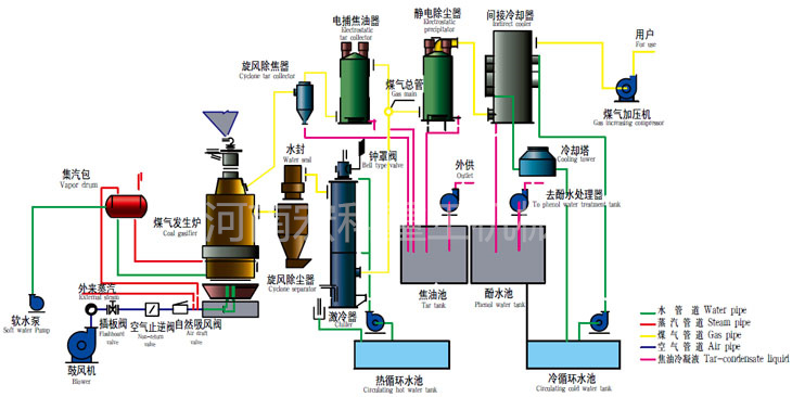 兩段式煤氣發(fā)生爐是由干餾段和氣化段組成的煤氣化設(shè)備。它以40~60mm的煙煤為原料,在煤氣爐上段中進行干餾,干餾生成的半焦進入兩段爐的下段進行氣化反應(yīng)。煤的干餾和氣化集中在同一氣化爐內(nèi)完成,對生成的干餾煤氣和氣化煤氣經(jīng)優(yōu)化配置的后處理設(shè)備分別進行除塵、除油、冷卻、脫硫等工藝處理。經(jīng)過處理后的潔凈煤氣經(jīng)加壓輸送系統(tǒng)供給工業(yè)窯爐作為燃料使用。整個系統(tǒng)包括煤場、渣場、煤提升系統(tǒng)、煤倉、供煤系統(tǒng)、供風(fēng)系統(tǒng)、兩段爐氣化系統(tǒng)、除塵凈化系統(tǒng)、冷卻系統(tǒng)、輕焦油捕集及回收系統(tǒng)、酚處理及酚水焚燒系統(tǒng)、脫硫系統(tǒng)、自動控制系統(tǒng)、煤氣貯存及加壓輸出系統(tǒng)。