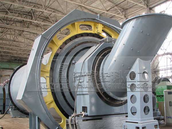 原煤由喂料設(shè)備進(jìn)入到磨機(jī)的進(jìn)料裝置中,溫度為300℃左右的熱風(fēng)也通過(guò)進(jìn)風(fēng)管進(jìn)入進(jìn)料裝置,含有水分的原煤在此處就開(kāi)始進(jìn)行熱交換;當(dāng)原煤進(jìn)入磨機(jī)的烘干倉(cāng)時(shí),由于烘干倉(cāng)內(nèi)設(shè)有特制的揚(yáng)料板將原煤揚(yáng)起,使得原煤在此處進(jìn)行強(qiáng)烈的熱交換而得到烘干,烘干后的煤塊通過(guò)設(shè)有揚(yáng)料板的雙層隔倉(cāng)板進(jìn)入粉磨倉(cāng)。粉磨倉(cāng)內(nèi)裝有研磨體(鋼球),煤塊在此倉(cāng)內(nèi)被粉碎、研磨成煤粉。在煤塊被粉碎的同時(shí),由專(zhuān)用的引風(fēng)機(jī)經(jīng)過(guò)磨機(jī)的出料裝置將已粉碎的煤粉及氣體一同帶出磨機(jī),較粗的顆粒會(huì)經(jīng)過(guò)出料裝置的返料螺旋返回到粉磨倉(cāng)內(nèi)進(jìn)行再次粉磨。